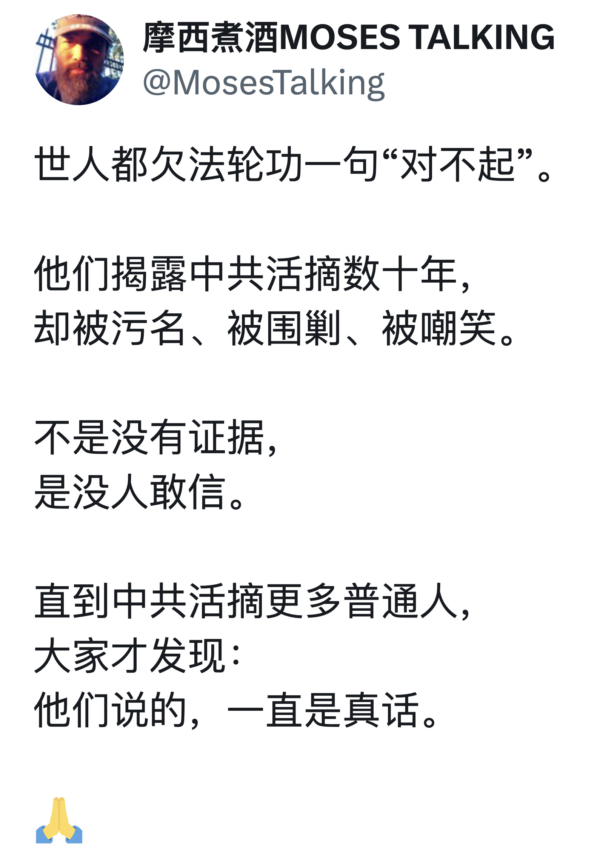 旅美知名博客「摩西煮酒」近日在社交平台X發文,稱「世人都欠法輪功一句對不起」,引發網民熱議。在接受《大紀元》採訪時,他反思了自己從不相信,到認同活摘器官真相的心路歷程,並表示:「歷史最大的悲劇,不是沒有警告,而是警告出現時沒有人相信。」他直言:在一個普遍說謊的時代,說出真相需要勇氣。