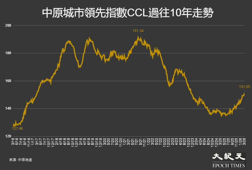 追蹤香港二手樓價的中原城市領先指數CCL於20日公布最新的數值為151.05點,截至3月15日,按周指數上升0.50%,按月則升1.11%,自疫情爆發以來(2020年1月26日起)跌14.94%,而3年的累積跌幅為9.45%。大型、中小型單位按周分別錄得上升0.37%、升0.52%,3年累積跌13.20%、跌8.66%。