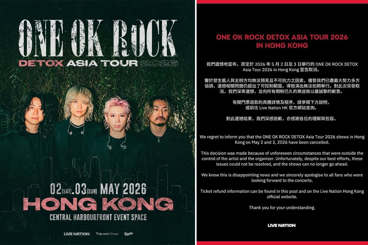 Live Nation在IG表示,鑒於發生藝人與主辦方均無法預見且不可抗力之因素,儘管已盡最大努力多方協調,遺憾相關問題仍超出了可控制範圍,導致演出無法如期舉行。原定於今年5月2日及3日舉行的ONE OK ROCK DETOX Asia Tour 2026 in Hong Kong宣告取消。