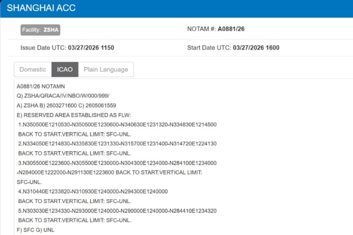 中共近日透過「飛航任務通告」(NOTAM)宣布,自3月27日至5月6日,在上海外海至黃海北部劃設五個空域受限區,範圍橫跨約340英里(約550公里),但未宣布任何演習。這項通告令軍事專家不安的特點在於其「不尋常的時長」與「高度限制」。