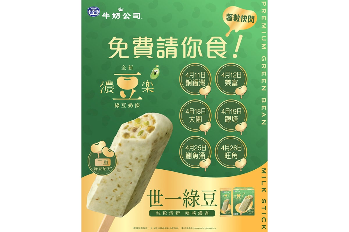 雀巢®牛奶公司™將於2026年4月11日起,一連三個周末(4月11、12、18、19、25、26日)在鬧市免費派發多達5,000支「濃豆樂」綠豆奶條。只需即場關注並追蹤雀巢®雪糕社交平台,即可換領一支「濃豆樂」綠豆奶條。除此之外,凡於現場填妥電子問卷,或於任何社交平台上發布有關活動帖文,更可額外換領「濃豆樂」紅豆奶條乙支。