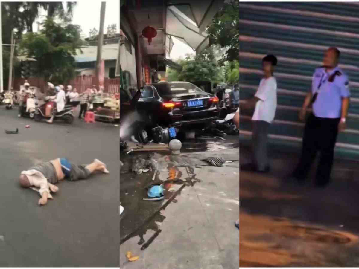 網傳多段影片顯示,一名老人失去知覺躺在馬路中央,一輛黑色奔馳撞到一間超市門口的台階上,車子底下及周圍幾輛電單車被撞毀,車子前方車輪下有一片血跡,疑似有人被撞受傷。