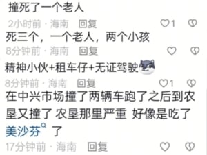 日前,海南儋州發生一宗駕車撞人事件。一名男孩嗑藥後開車在大街上一路衝撞,據傳至少造成三人死亡。