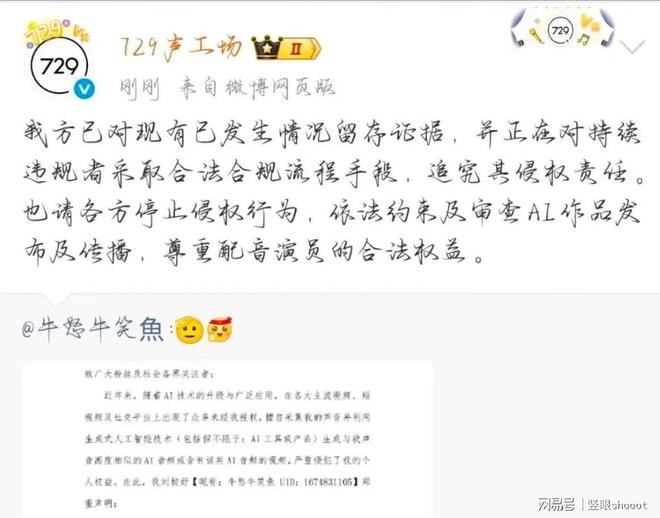 「邊江工作室」、「729聲工場」、知名配音演員季冠霖(甄嬛傳配音)、呂豔婷(哪吒配音)、夏磊、馬正陽等在內的多名業界代表集體發布聲明,要求官方正視AI仿聲侵權,並提出「三禁」主張。