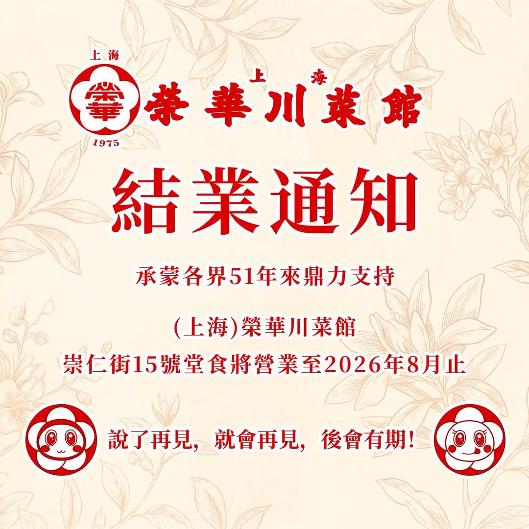 本港餐飲業結業潮未止,於觀塘屹立逾半世紀的老牌食肆「上海榮華川菜館」今日(13日)透過社交媒體宣布,其位於崇仁街的堂食業務將營運至今年8月底止。該店曾兩度入選米芝蓮指南,第三代負責人稱,眼見門前人流「凋零得令人心碎」,在看不到前景下只能「含淚結束」。
