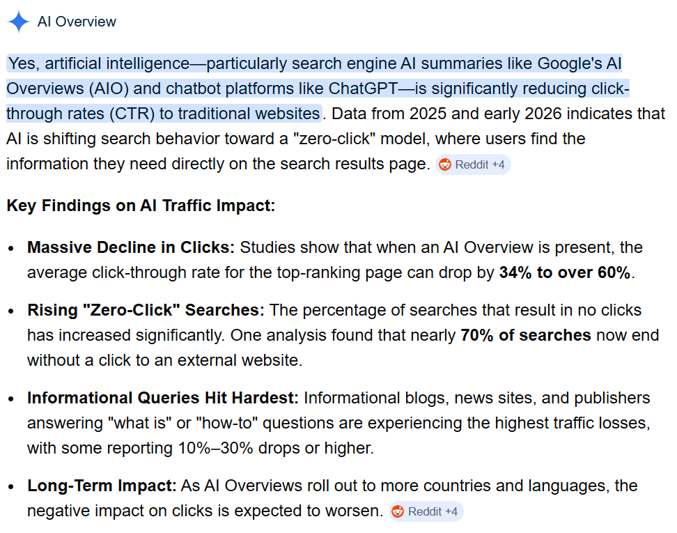 由Google推出的AI Overview等功能,已使零點擊搜尋比例從2024年的58%躍升至60%以上,在行動裝置上更高達77%(據SparkToro與Similarweb等機構研究)。當AI Overview出現時,有機搜尋點擊率(CTR)可暴跌六成以上,從1.76%降至0.61%,付費廣告CTR也從19.7%跌至6.34%(據Seer Interactive)。Stack Overflow等Q&A網站自ChatGPT推出後,問題量更銳減50%以上,慘過腰斬。