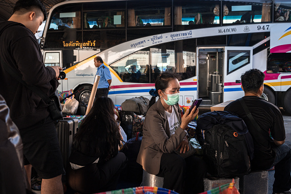 2026年4月10日,在泰國新年(潑水節)慶祝活動開始前,乘客們在曼谷Mo Chit 2巴士總站等候登車返回家鄉。(chanakarn LAOSARAKHAM / AFP via Getty Images)