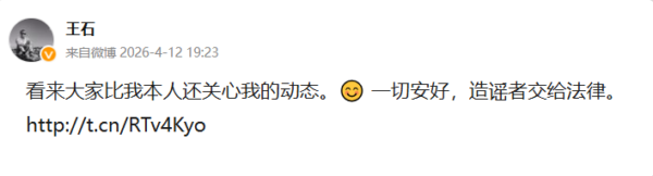當天晚間,王石在微博寫道:「看來大家比我本人還關心我的動態。一切安好,造謠者交給法律。」
