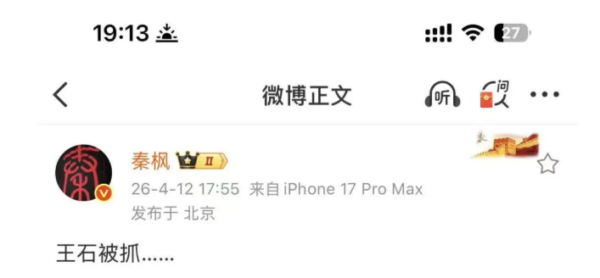綜合財聯社和《新京報》報道,4月12日,微博大V秦楓於微博稱「王石被捕」,此消息迅速在網絡熱傳。但目前已無法在秦楓微博帳號看到這一帖文。